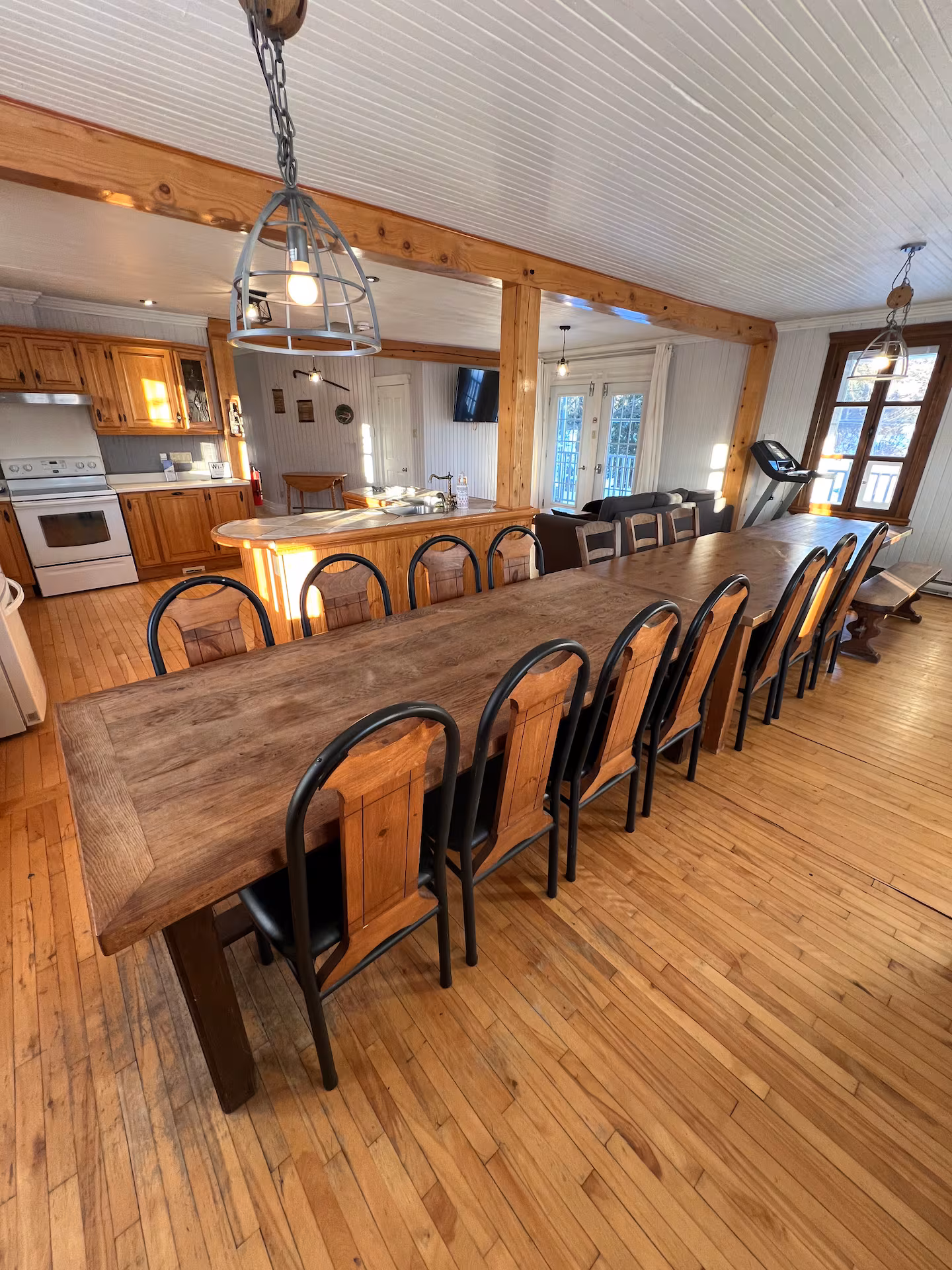 Une salle à manger spacieuse pouvant accueillir de grandes tablées : les trois tables en bois massif peuvent être réunies pour recevoir confortablement jusqu’à 20 personnes.