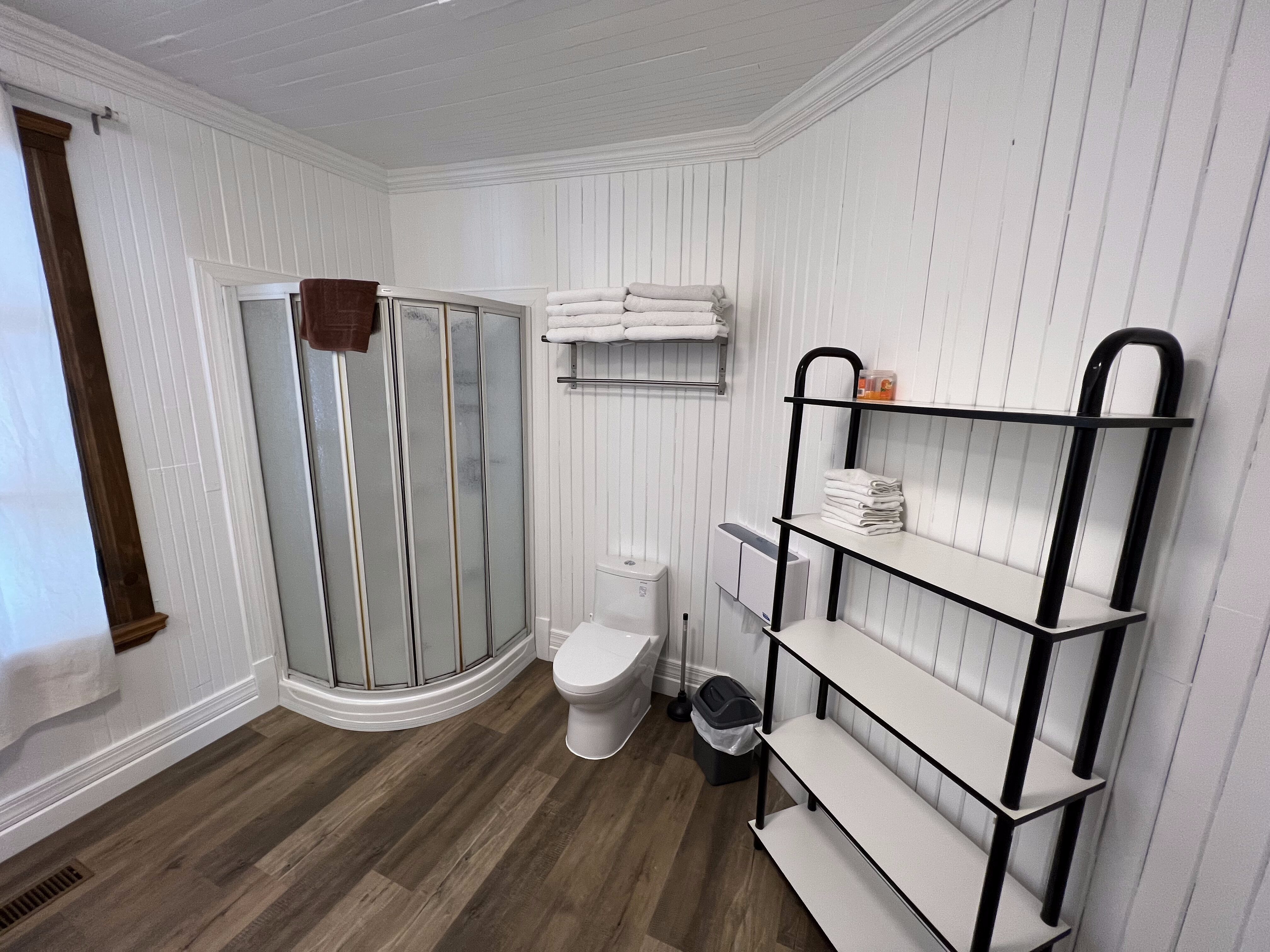 Deux salles de bain complètes avec douche et toilette, une sur chaque étage.