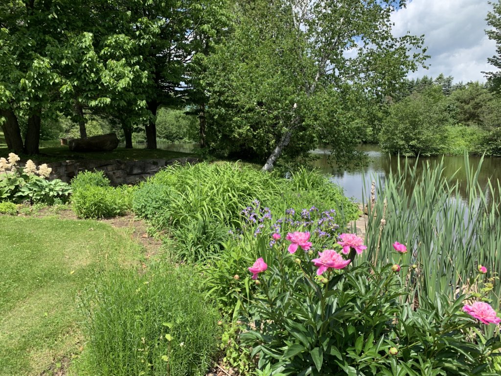 Un espace cocktail charmant sur trois étages avec vue magnifique sur un lac bordé d’arbres.
